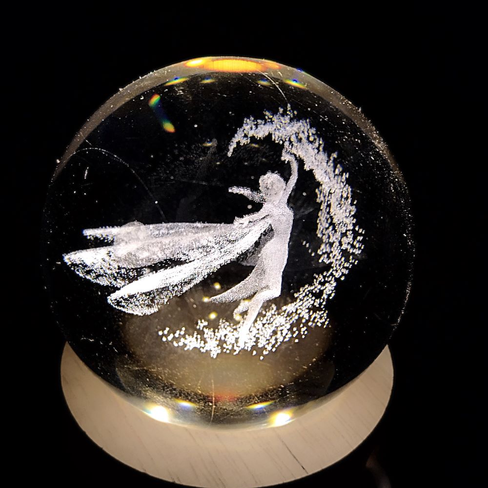 Μια πρωτότυπη κρυστάλλινη σφαίρα . Η επεξεργασία έγινε με χαρακτική laser. Η ξύλινη βάση διαθέτει led φωτισμό. Λειτουργεί με USB καλώδιο και on/off διακόπτη.