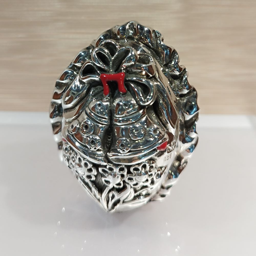 Ένα ανάγλυφο διακοσμητικό αυγό από ασήμι ελληνικής κατασκευής. Λαμπερό και διαχρονικό. Την επιφάνειά του διακοσμούν μικρές καμπάνες και λουλούδια.