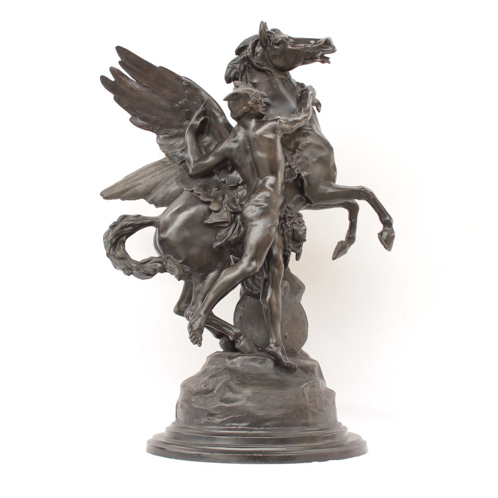 Το άγαλμα είναι κατασκευασμένο από αντιμόνιο και μπρούτζο. Επάνω στο μέταλλο έχει αποτυπωθεί με κάθε λεπτομέρεια η κίνηση του αλόγου και η επιβλητικότητά του καθώς και η δυναμικότητα της αντρικής φιγούρας. Προέλευση :Κίνα